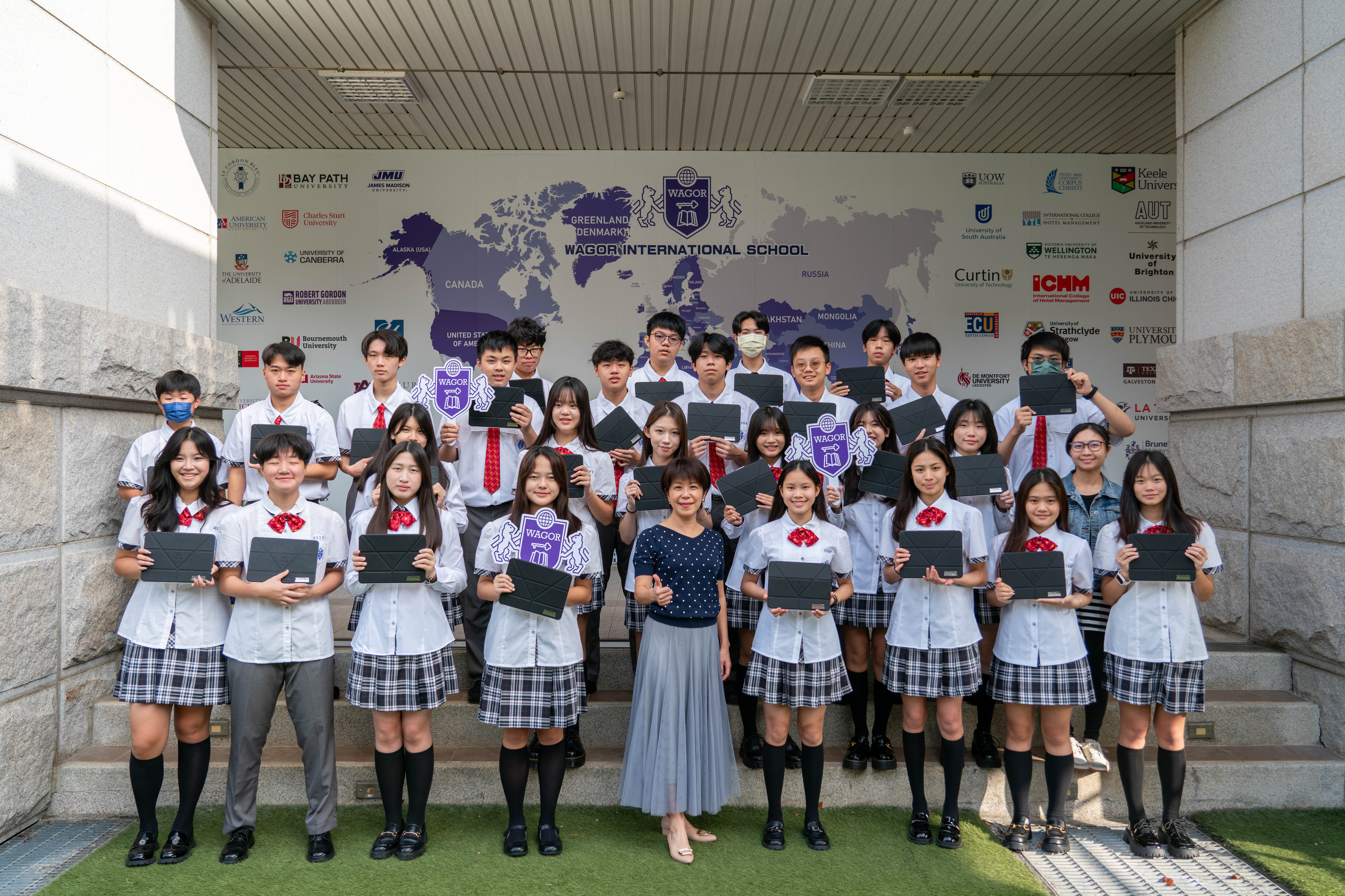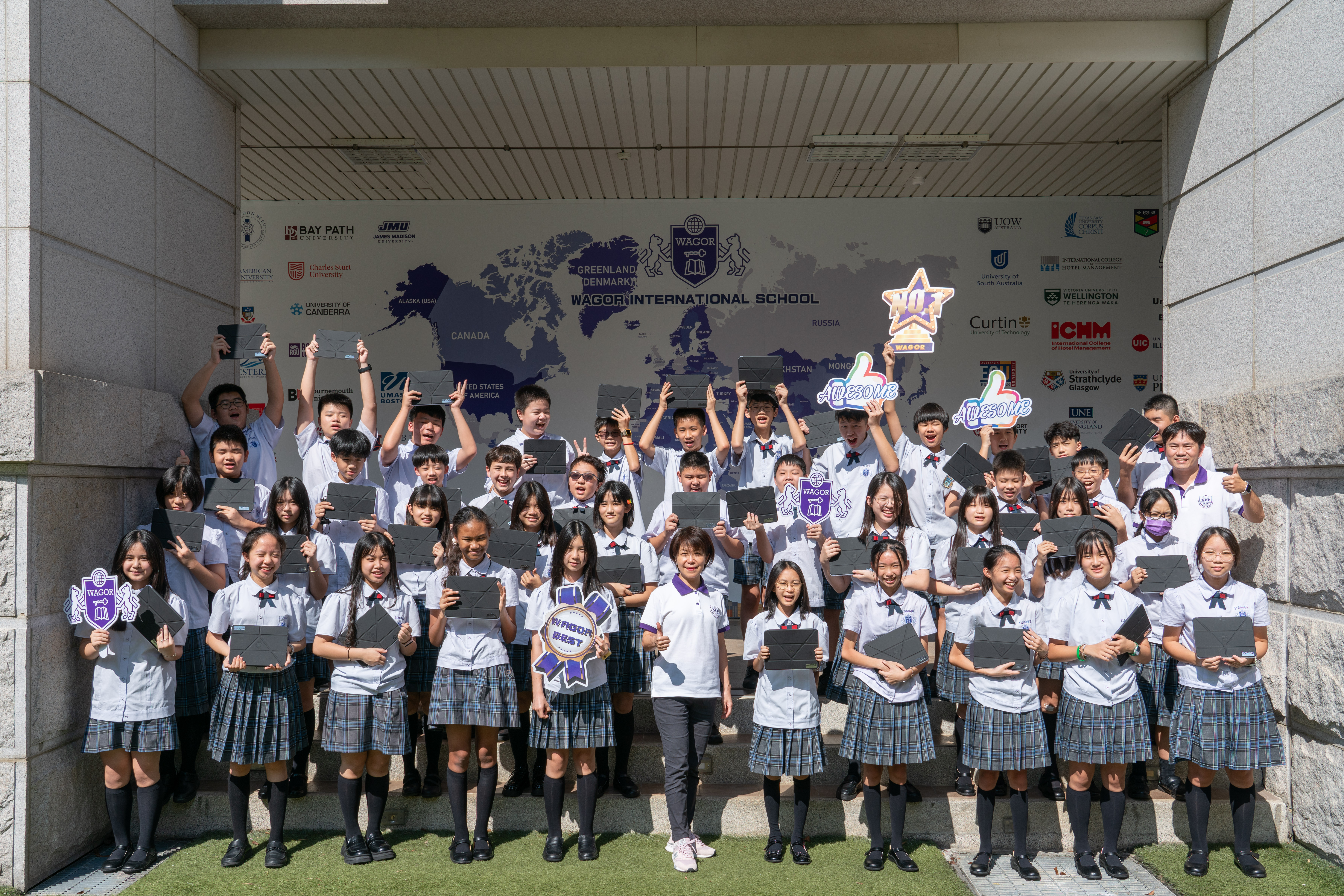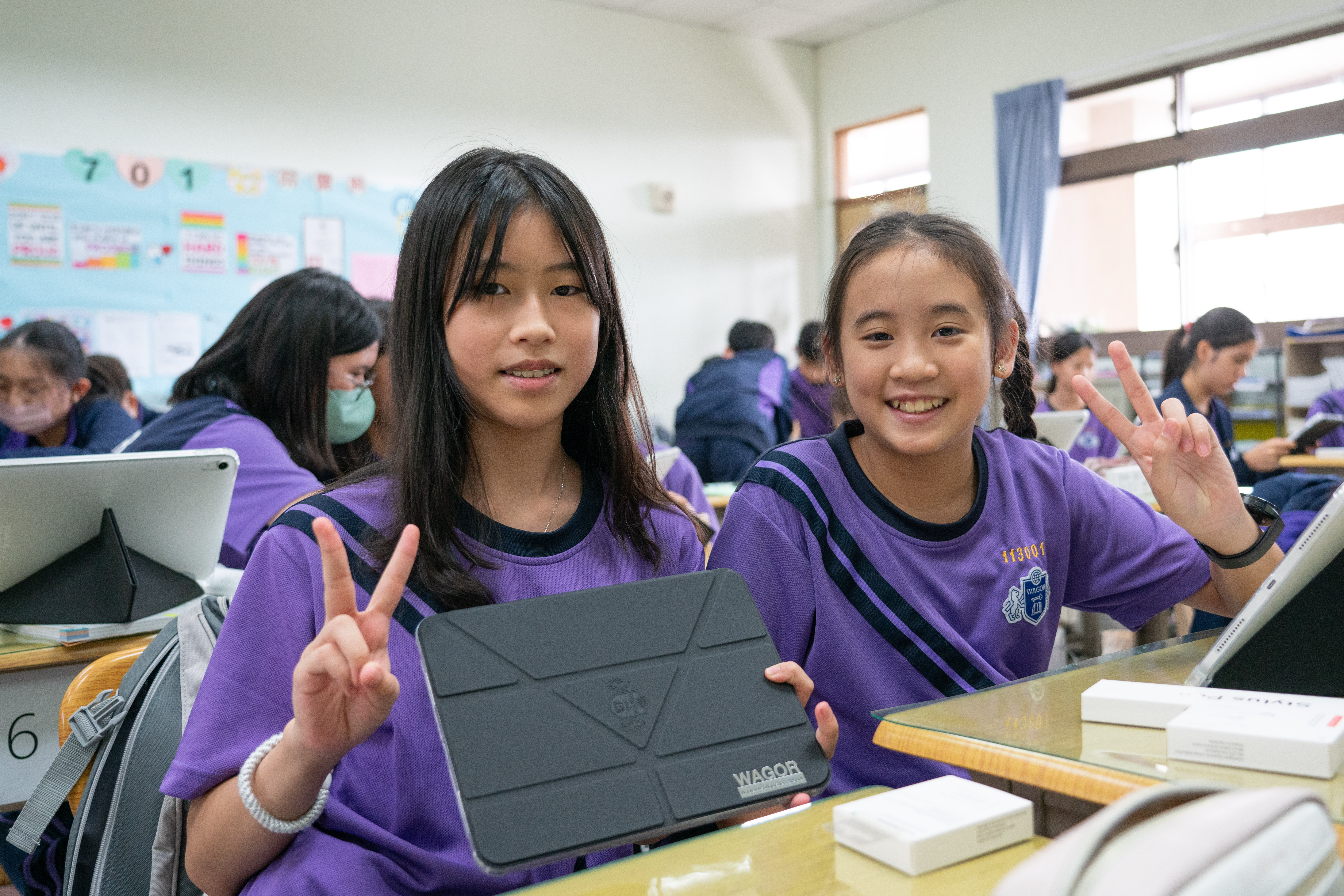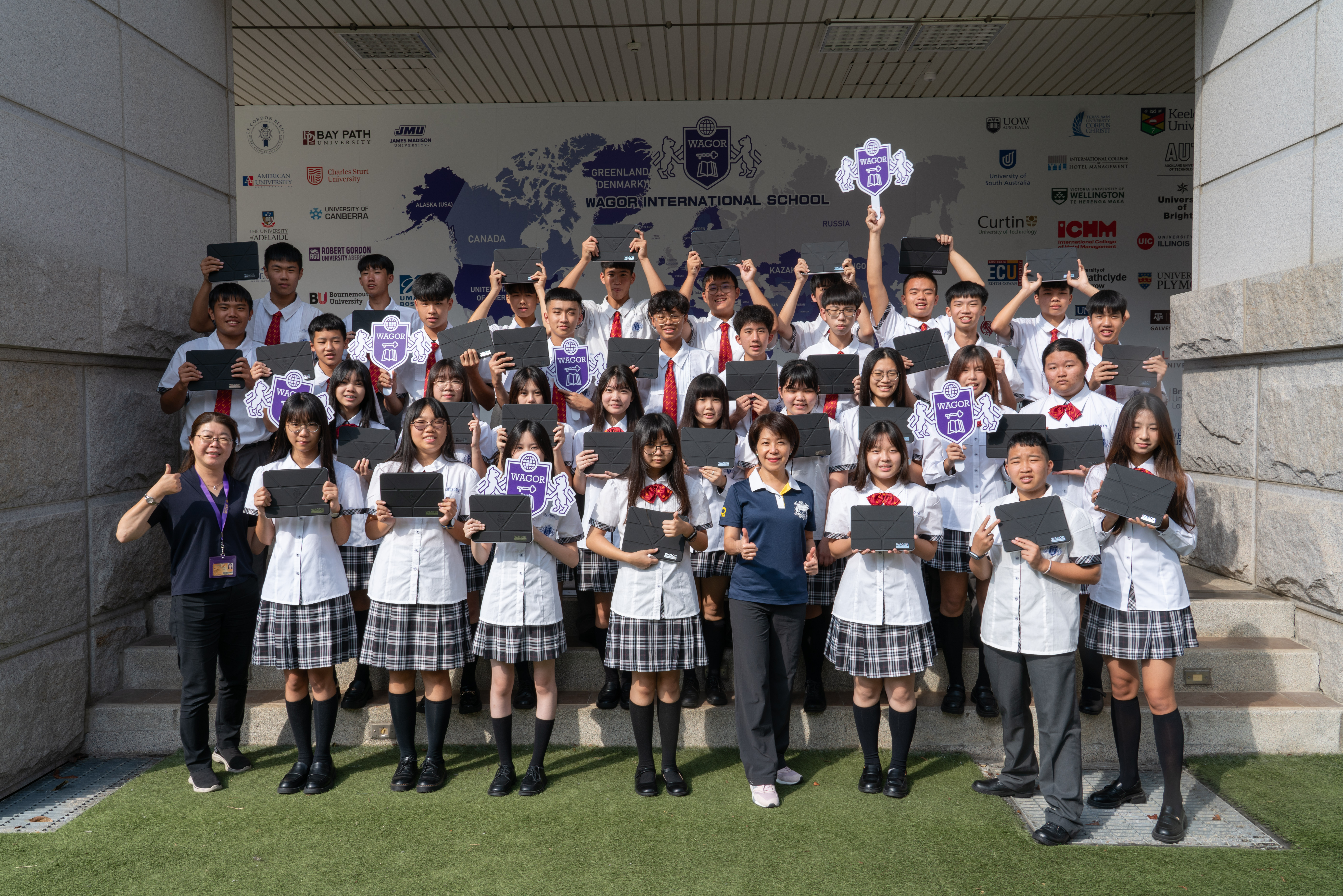 班級團照中大家開心的秀出 iPad 保護殼上的葳格 logo,象徵自律和行動學習的開始,期待大家善用資源,盡情享受葳格用數位科技輔助教學的課堂,學會與AI人工智慧協作,更重要的是一定要「終生學習」,思考自己應該聚焦在什麼樣的能力,才能獲得科技以外的絕對優勢,與AI人工智慧加乘後脫穎而出。