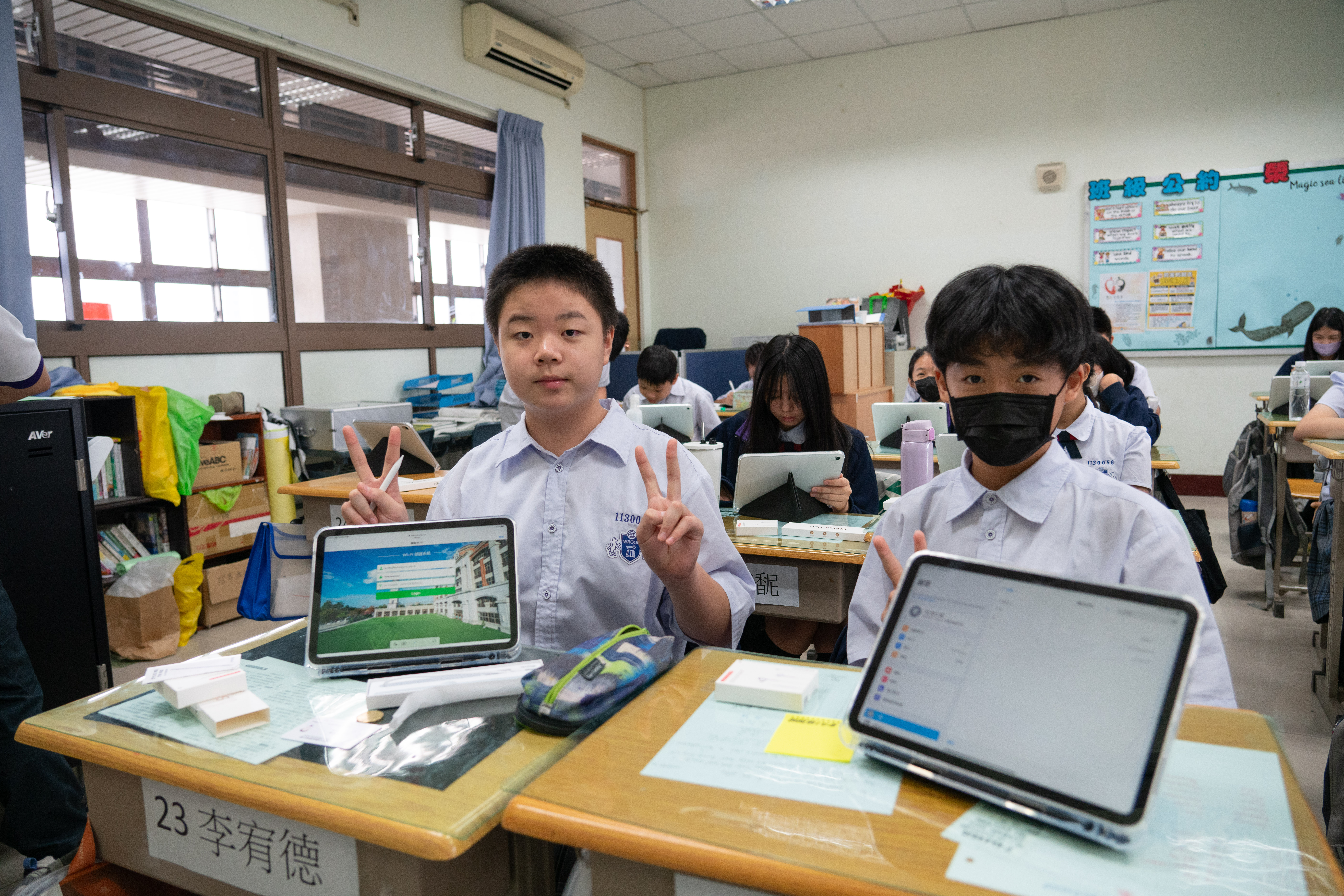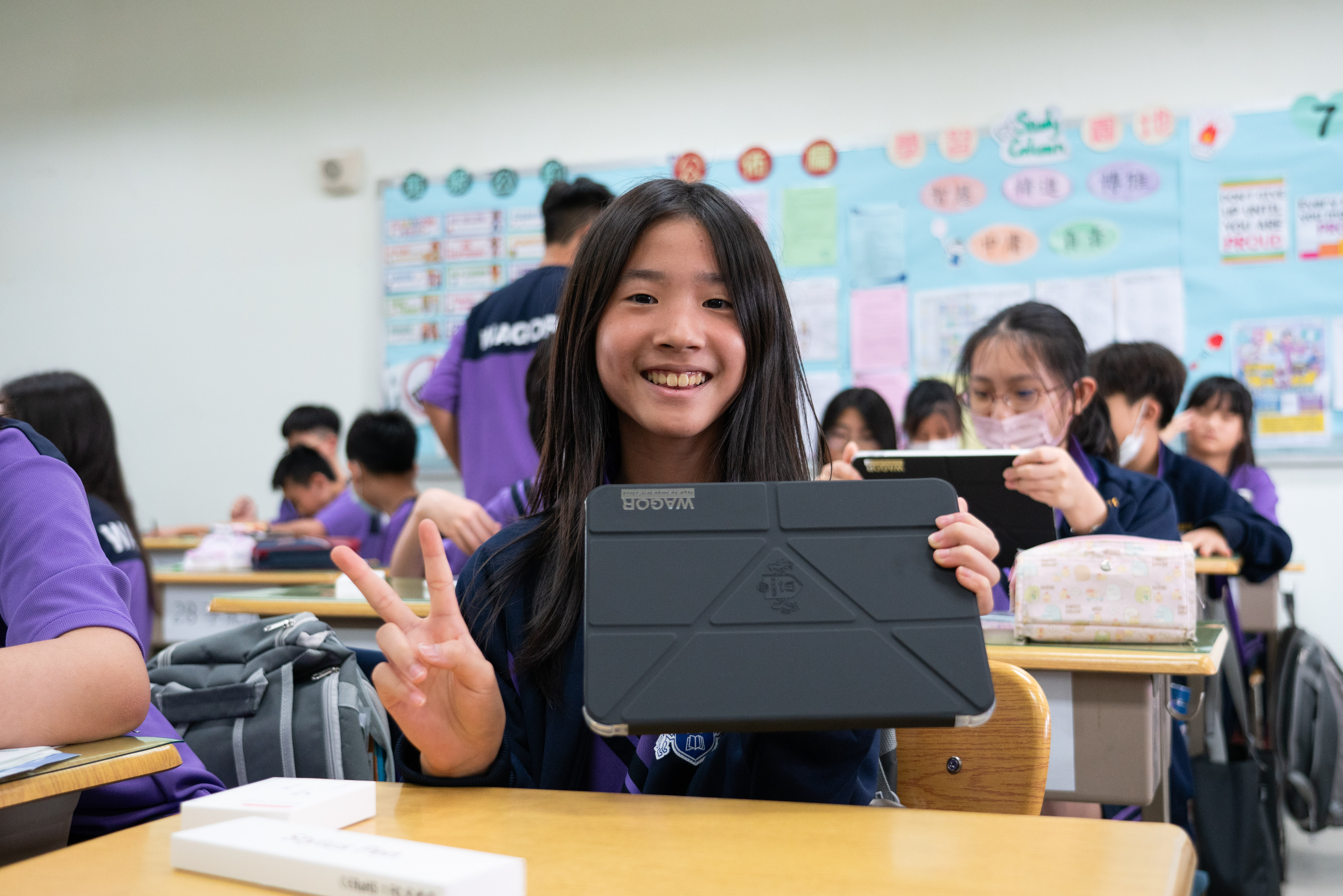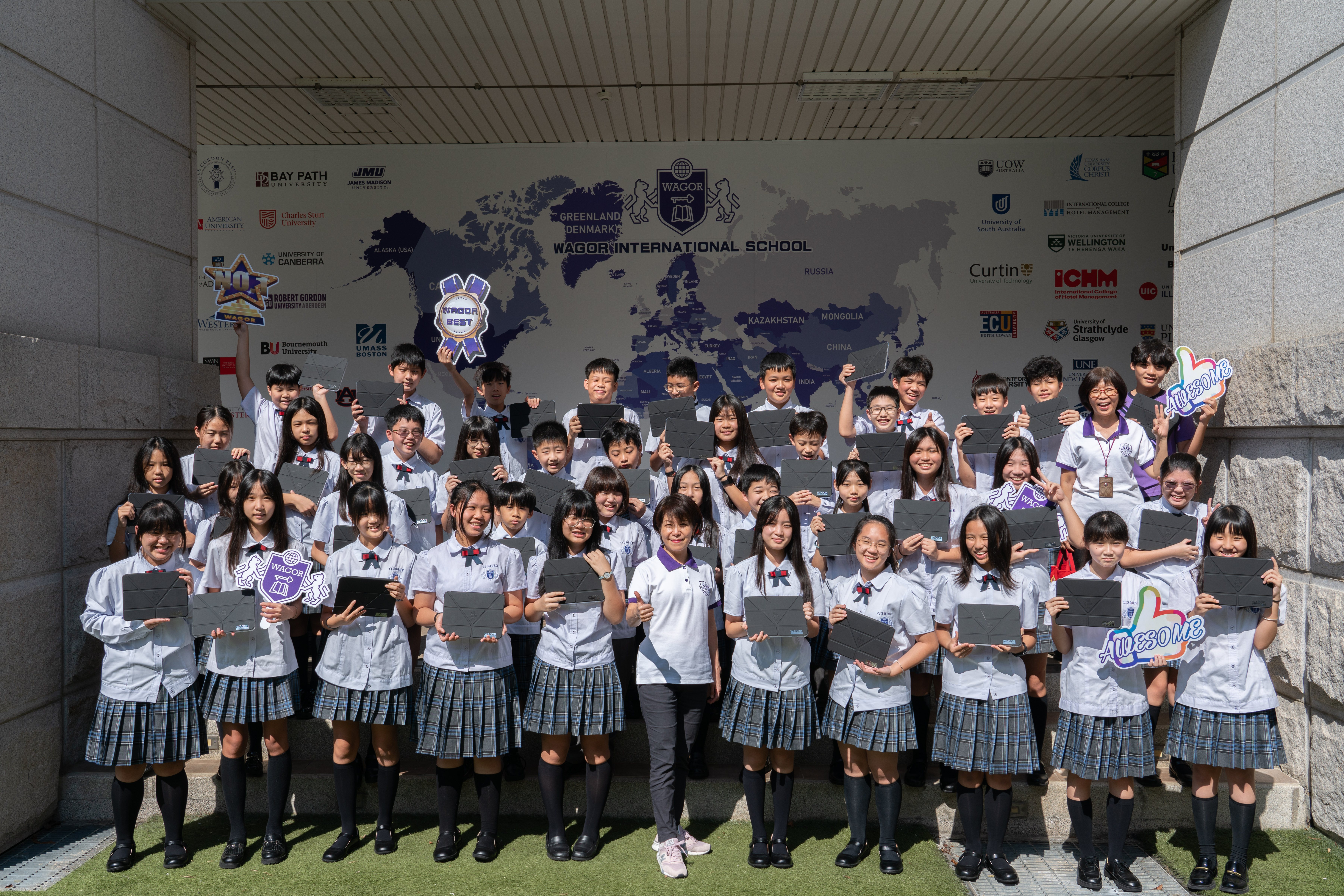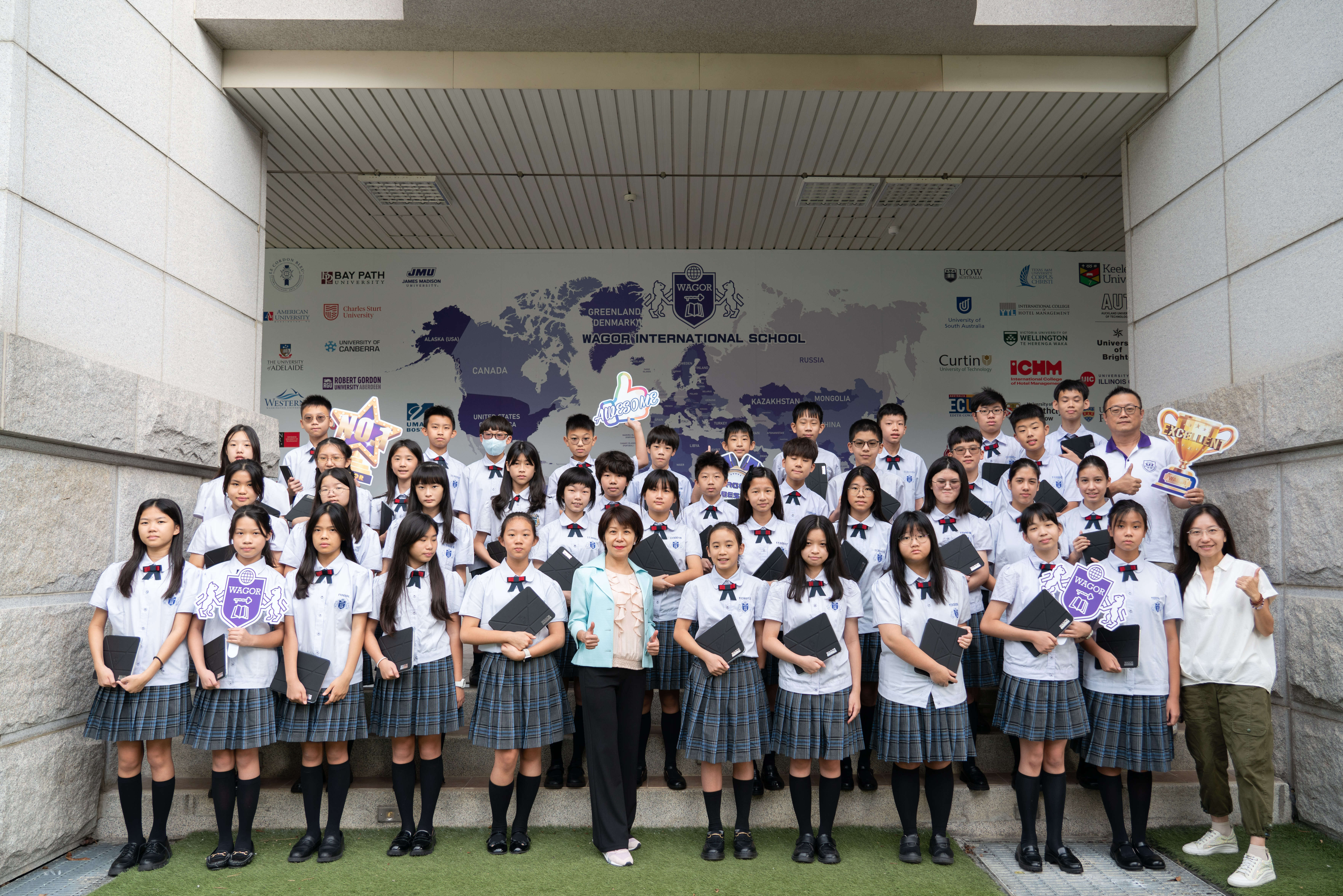 班級團照中大家開心的秀出 iPad 保護殼上的葳格 logo,象徵自律和行動學習的開始,期待大家善用資源,盡情享受葳格用數位科技輔助教學的課堂,學會與AI人工智慧協作,更重要的是一定要「終生學習」,思考自己應該聚焦在什麼樣的能力,才能獲得科技以外的絕對優勢,與AI人工智慧加乘後脫穎而出。