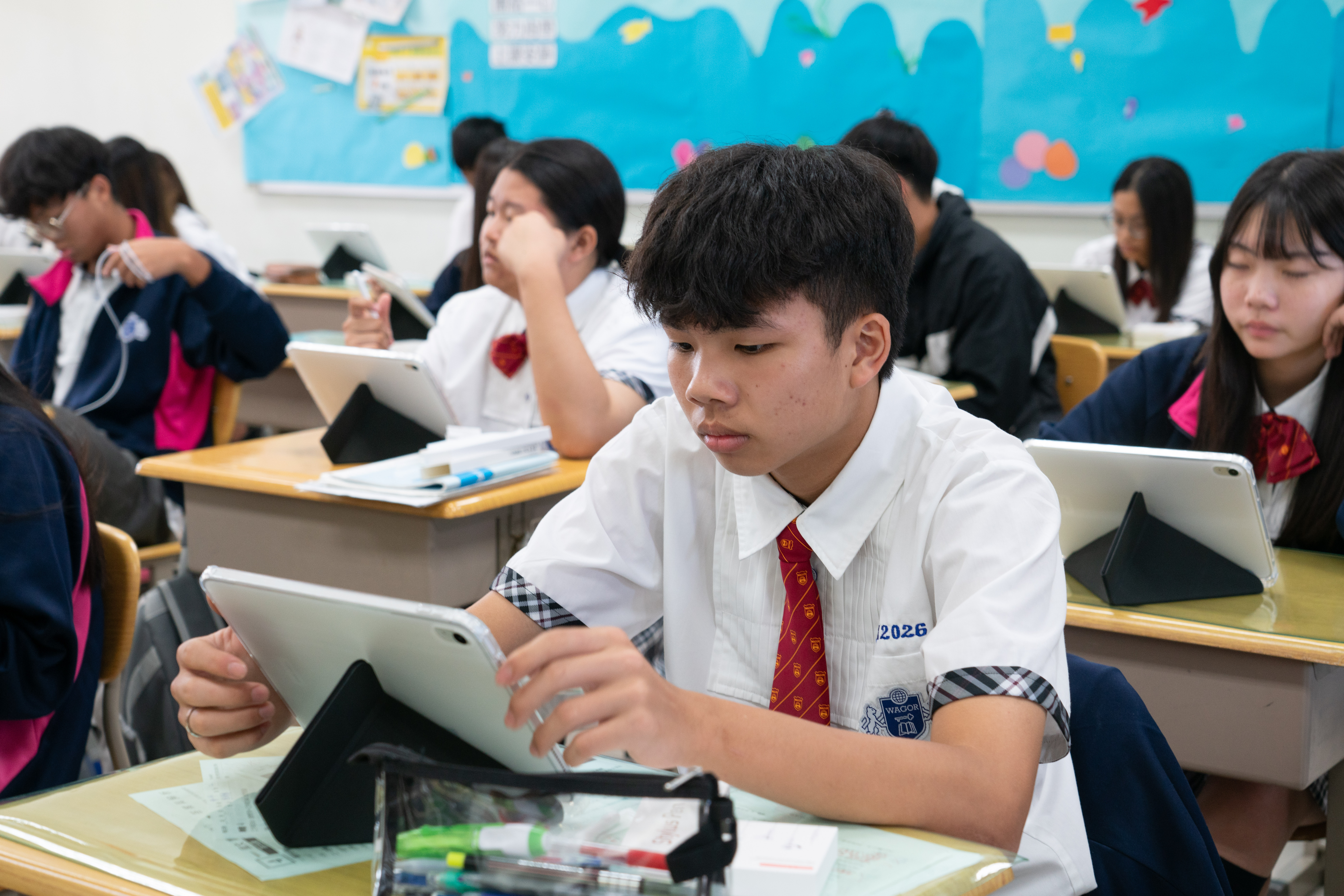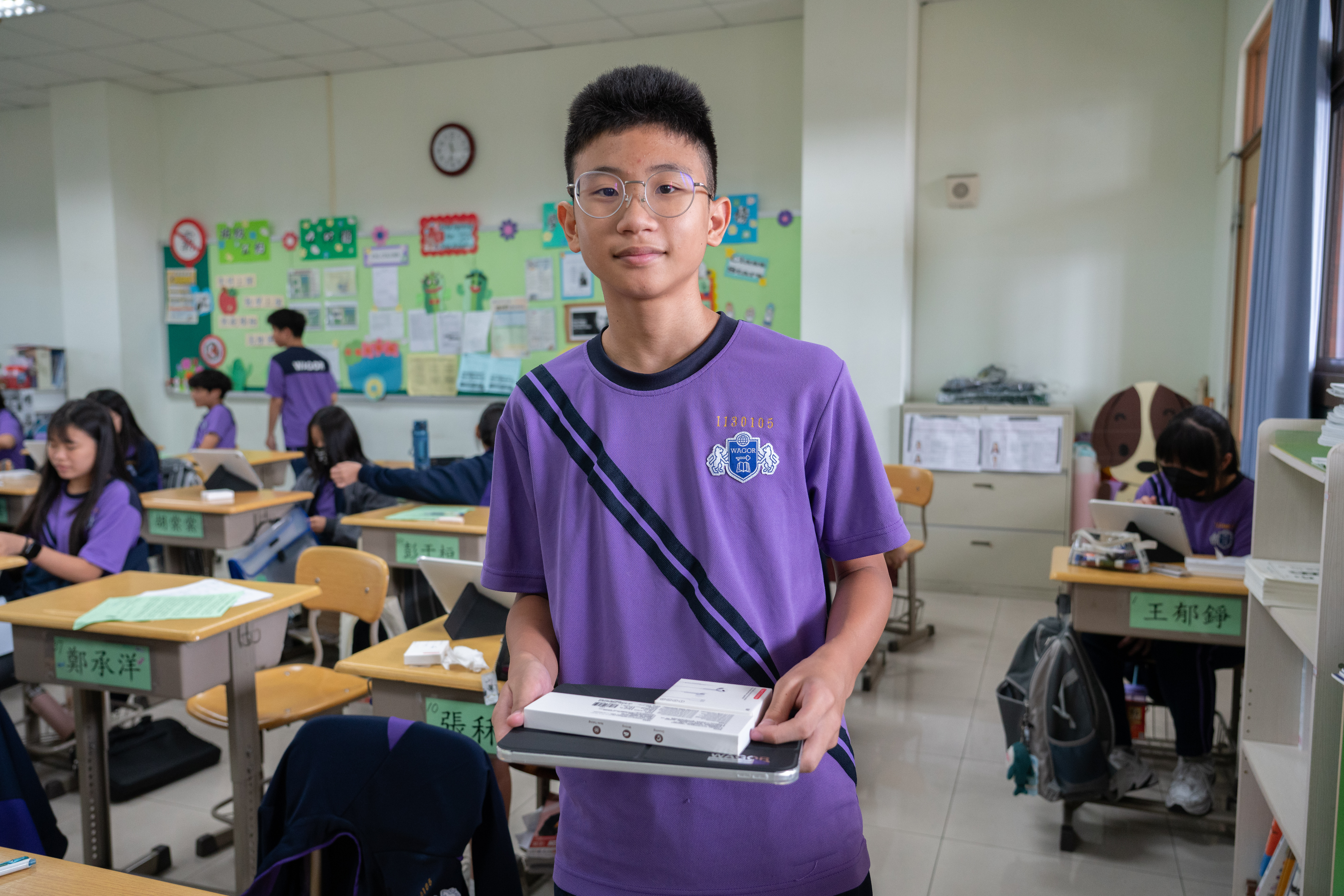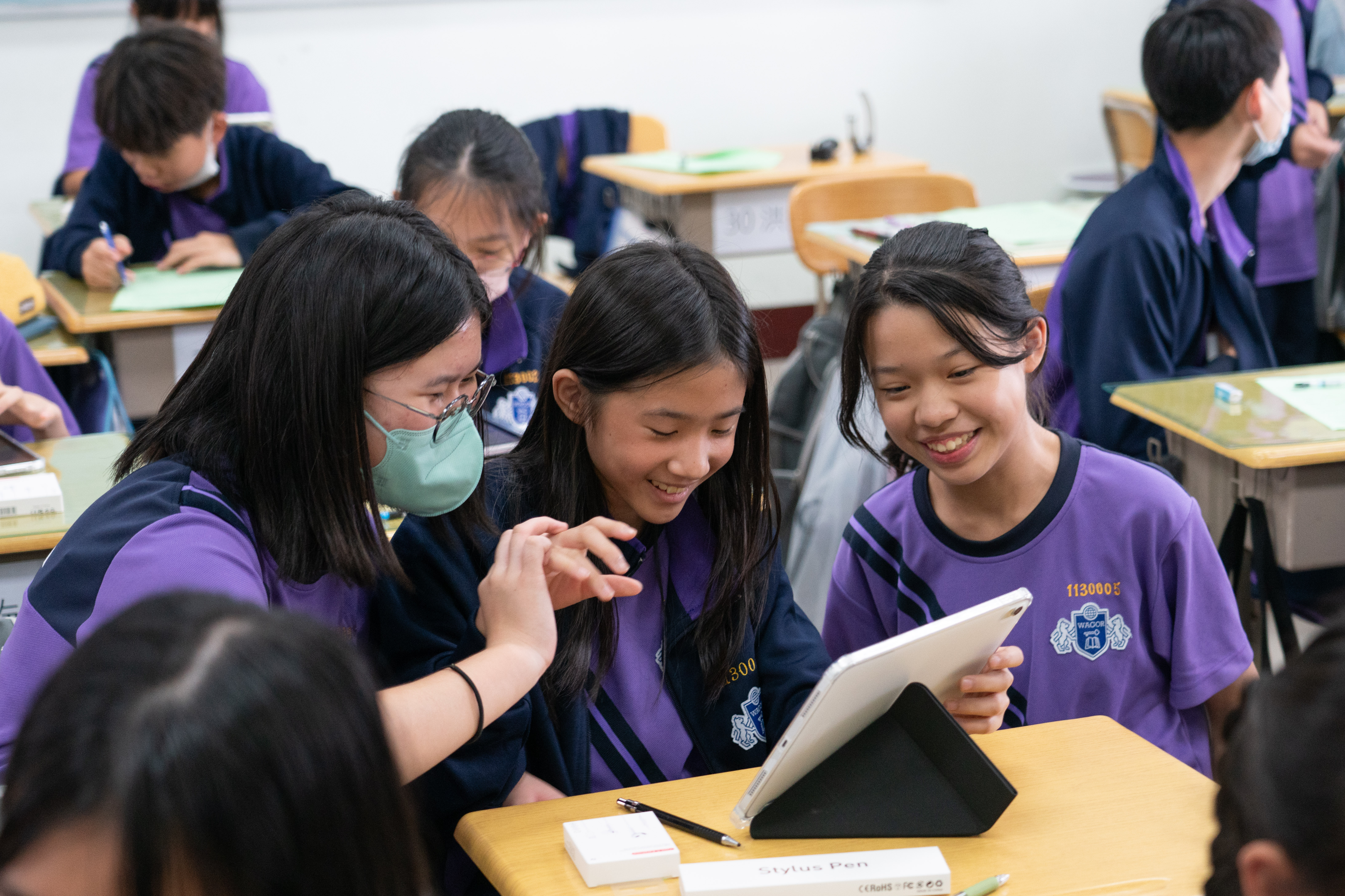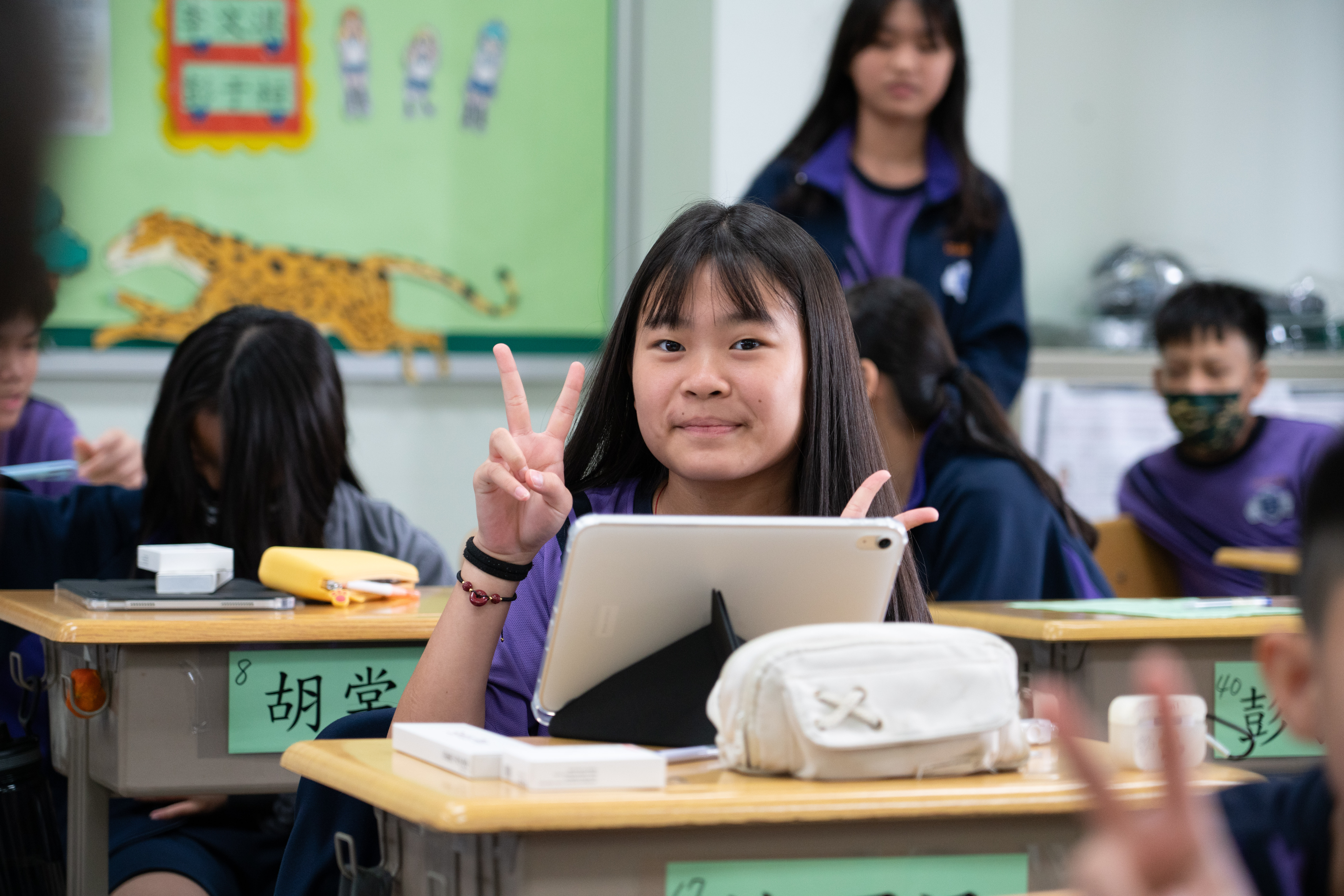 班級團照中大家開心的秀出 iPad 保護殼上的葳格 logo,象徵自律和行動學習的開始,期待大家善用資源,盡情享受葳格用數位科技輔助教學的課堂,學會與AI人工智慧協作,更重要的是一定要「終生學習」,思考自己應該聚焦在什麼樣的能力,才能獲得科技以外的絕對優勢,與AI人工智慧加乘後脫穎而出。